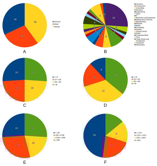 Characterization of the SMEs participating in the case study—(A) Main activity sector; (B) sub-sectors of activity; (C) age of the enterprise; (D) number of employees; (E) business revenue (scale); and, (F) exports as % of business revenue (scale).