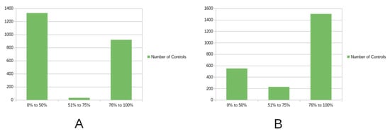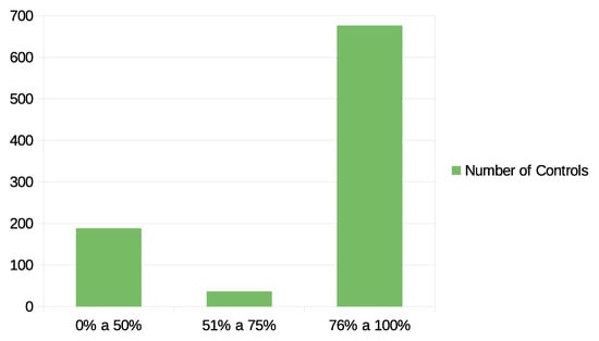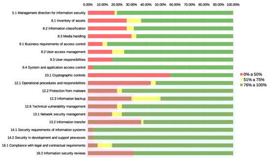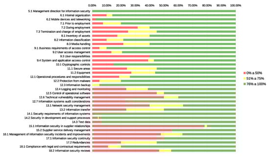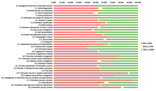 By analysing Figure 3 and Figure 5, with the distribution of conformity by predefined groups for Type 1 and Type 2 auditing schemes, it is possible to note the existence of a considerable number of controls with a low level of conformity (below 50%). This is related to the fact that a set of ISO-27001:2013 standard controls are difficult to apply in SMEs. Besides that, while comparing the evolution from the first to the second auditing stages in Type 2 auditing, it is possible to observe an overall positive evolution in the acceptance level higher than , as depicted in the comparison between Figure 6 and Figure 7.