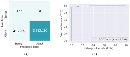 The trained SVM model is a Support Vector Classifier (SVC) using the linear kernel. The hyper-parameters were primarily the default parameters in the Scikit-Learn package, except for the penalty score set to 1 and the maximum iterations set to 100,000 as replicated by [14]. Rather than evaluating the model using the training and testing split and as explained in Section 2.3, four-fold cross-validation was used. Similar to the method of [14], the combined training and testing datasets were used to generate the confusion matrix. The generated confusion matrix can be seen in Figure 1a, and the ROC curve in Figure 1b. Viewing the confusion matrix, the model inaccurately predicts 415,935 true attack traffic as predicted benign traffic. The ROC curve and, consequently, the AUC score show that the model was highly capable of detecting attack traffic over benign traffic. Further, the accuracy, recall, precision and F1 scores can be seen in Table 3.