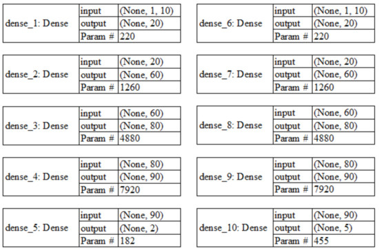 The trained ANN had one input layer, three intermittent layers and one output layer. The input layer was composed of ten nodes, equally to the number of features. The intermittent layers are 20, 60, 80, 90, respectively. The output layer was either two for binary classification or five for multi-class classification. The activation function of the intermittent layers are TanH, and the output activation layer was Sigmoid. Sigmoid was chosen for the output layer to replicate the [14] method because Sigmoid models are more robust [40]. The ANN designs for both binary and five-class classification layers can be seen in Figure 2. The left side shows the ANN design for the binary classification, while the right side shows the ANN design for multi-class classification.