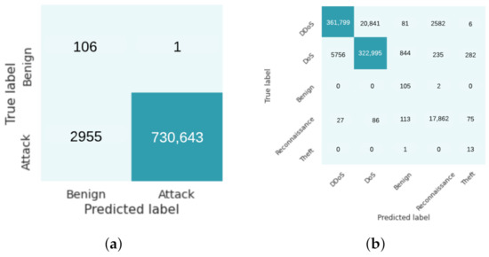 The confusion matrices for the ANN were calculated using the testing dataset. The testing dataset is used rather than the full dataset with the SVM model because there is a different threat model. As stated in Section 3.2, the ANN’s threat model was that the attacker can manipulate data after the model has been deployed. The testing dataset was used to simulate adversarial examples by an attacker. The binary classification confusion matrix in Figure 3a, shows that the model incorrectly classified 2955 true attack records as benign. In Figure 3b, the confusion matrix for five-class multi-classification shows that the model inaccuracies lie in predicting more labels as DDoS or DoS compared to their true labels. Further, Table 3 shows that the ANN can report very high accuracy, recall, precision, and F1 scores while maintaining a low loss score.