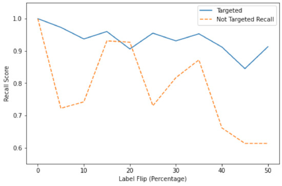 Adversarial attacks in traditional machine learning are more effective at the training stage rather than the testing stage. Attacking the model at the training stage will create fundamental changes to the machine learning model’s classification accuracy. In contrast, an attack at the testing or deployment stage can only take advantage of inherent weaknesses in the model [36]. An adversary can affect either the features of a dataset (feature noise) or the labels of the dataset (label noise) [36]. Label noise or also referred to as label flipping, focuses on changing the labels that are used to train a model. Label flipping seems to be a more effective method of tricking a machine learning model [21,37]. The threat model of a label flipping attack is to influence the model by providing inaccurate labels during the model’s training. If the labels are not correct, then the model cannot be trained integrally and correctly [38]. There are different strategies related to label flipping, including random or targeted attacks. Random label flipping entails selecting an arbitrary percentage of labels and changing them. For example, a label classifying a record as malicious could be switched to benign or vice versa. Targeted label flips focus on flipping labels that have the most significant effect on the model’s performance. According to [39] SVMs can often be more robust against adversarial machine learning, and therefore a suitable choice for deployment in adversarial environments. If attackers have access to feed incorrect labels to the machine learning model during training, then they can likely best achieve their objective [20].