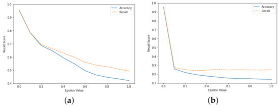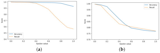 Nevertheless, ref. [45] brought up the concern that the FGSM perturbs the entire dataset of which it is given. The impact of complete data perturbing is two-fold. Firstly, by perturbing the Bot-IoT dataset, the features primarily impacted are those residing within network packet headers. A layer seven firewall could likely detect these kinds of attacks depending on the algorithm used. Secondly, ref. [45] propose to use the JSMA method instead of FGSM because JSMA perturbs a portion of the dataset rather than the entire dataset. On the contrary, ref. [43] suggests that FGSM is better used in experiments because of the drawback that JSMA has with high computational power. FGSM against the NSL-KDD was also used by [46], who found that perturbing the reduced the accuracy of their CNN from 99.05% to 51.35%. Besides, ref. [46] experimented against the NSL-KDD dataset using the JSMA method and found that the accuracy decreased from 99.05% to 50.85%. Comparing these results to the findings of our work’s experiments, we observed a similar decrease in the accuracy, as it can be seen in Section 4.