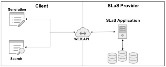 The reference scenario adopted in this work is shown in Figure 1. It describes a cloud-based secure log storage service. The Client makes use of a web-based Application Programming Interface (WEB API) to transfer its encrypted operational logs to the cloud, named SLaS Provider. In parallel, the Client can make use of the same WEB API to query, in a encrypted form, its logs and retrieve matching records. A SLaS application is foreseen in order to make use of the cloud’s potential and to enable the transfer of some CPU-intensive tasks from the Client to the SLaS Provider. The SLaS Provider stores the client-side encrypted logs in its database and performs search operations on them, without having access to clear text logs.