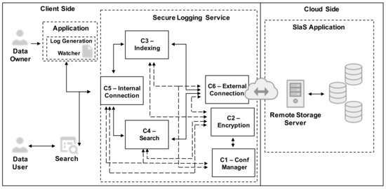 The External Connection (C6) component represents the bridge between the client side and the cloud side. This component acts as a dependency of the Indexing and Search components since it is the only possible gateway for log records to be stored and search queries to be performed. The External Connection component deals with the complexity of the cloud side connection and ensures the establishment of a secure channel between the two different sides of the proposed solution scenario. Additionally, this component makes the adoption and integration with different cloud providers more seamless.