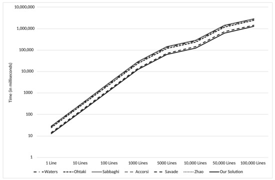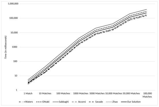 Savade et al. [87] proposed a technique to protect log records from tampering based on a system of linear equations, while still permitting search operations to be conducted over those records. The scheme is comprised of four functions: that returns a key pair using a security parameter s; that encrypts a message m, using , and outputs s; that outputs the trapdoor t using m and as input; and a test function that verifies if an encrypted keyword is present in the log records. This verification is conducted using a generalization of the inverse matrix concept [88].
