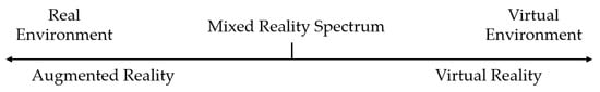 The concept of AR is very closely related to Virtual Reality (VR). Both terms describe some form of a perceptual combination of the virtual world and the real world. However, they are clearly differentiated by the Reality-Virtuality Continuum by Milgram et al. [10], depicted in Figure 1. In VR, a user’s perception is entirely dominated by virtual, computer-generated information. Users are immersed in a virtual environment and do not perceive the real world around them. Thus, VR is located on the virtuality end of Milgram’s continuum. In contrast, AR is located on the other end of the continuum. It superimposes the virtual information into the real world, while users perceive a combination of both the virtual and the real world. This immersion is achieved through three main functional features (FF) of AR [11,12]: