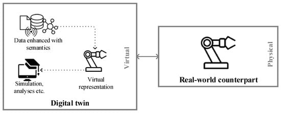Novel insights can be achieved with the DT, thanks to its key characteristics presented in Figure 2. Data concerning the real-world counterpart is enhanced with semantic technologies in order to represent the counterpart virtually [25], e.g., by creating an emulation or model. On this basis, simulations, analyses, etc., are conducted [26]. These, in turn, provide deep insights into the real-world counterpart’s present state and potential future.