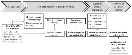 - Duplicate Removal & Initial Screening: In the second step, we remove duplicates (n = 80) that occurred within or between databases and checked the title, keywords, and abstract of the publications to remove publications which are not relevant for our studies (n = 260). The full texts of the remaining records (n = 95) are retrieved to assess their eligibility.