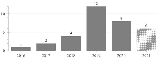 The first publication we determine relevant has been published in 2016. Along the following years, the number of published papers per year is increasing, as displayed in Figure 4. This trend seems to change with a smaller number of papers in 2020 and 2021. However, the number of relevant publications being published in 2021 is not yet representative as we only include the first half of the year into our search. Thus, the final number of publications from 2021 is very likely to be higher than shown in Figure 4. Additionally, the small number of years in which we were able to identify papers would not allow for a resilient interpretation of the seemingly decreasing amount of publications. It could just as well be that an over proportionally high number of papers was published in 2019 and that the approximately linear growth of previous years is continuing again in 2020 and 2021. However, due to the short time span for which data are available, such interpretations must be regarded as currently not verifiable hypotheses.