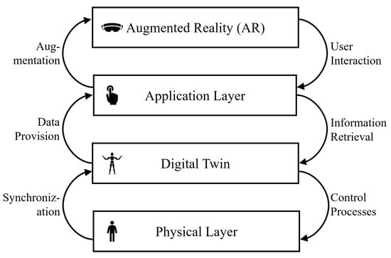 The underlying Physical Layer includes any hardware related to the use case under consideration. This physical layer is reflected in a Digital Twin. The DT is connected to the physical layer via synchronization processes that transport all necessary data from the physical to the DT and a control process that allows the DT to interact with its physical twin. The information and functionalities contained in the DT are accessed through applications or services located within the Application Layer. Within the application layer, any service can retrieve data from the DT by actively querying it. However, the applications can also be connected to the DT via a data provisioning process directly pushing new information from the DT to the application layer. The Augmented Reality, finally, allows the representation of the DT on the physical layer. It augments the physical layer with the information retrieved from the services within the application layer. This layered, service-based architecture allows a bi-directional, synchronous, and remote interaction of the user with the physical layer powered and contextualized by AR and DT, and vice versa.