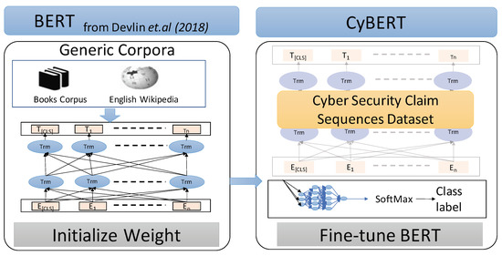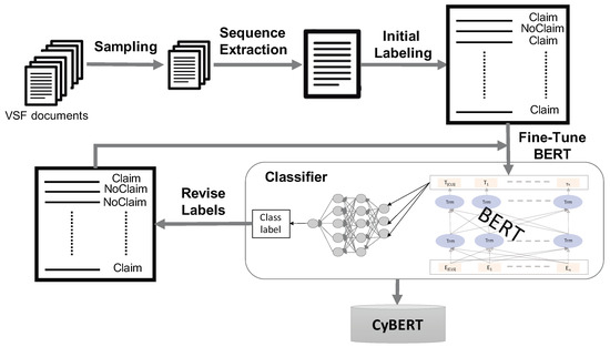 Figure 2 shows an overview of CyBERT workflow. To the best of our knowledge, there currently is no readily available dataset representing a corpus specific to cybersecurity that we could use for training CyBERT. Hence, we created a new labeled dataset that contains claim-related sequences. For fine-tuning, CyBERT is first initialized with BERT’s initial weights, adding dense layers and dropouts and subsequently tuning all layers and parameters using our labeled database and architecture.