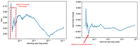 41]. In this method, the learning rate is initially low, and then it is increased exponentially for each batch. To find the best learning rate, we plotted training loss results for each batch. The best initial value of the learning rate was somewhere around the middle of the sharpest descending loss curve (left plot) or the lowest value in the loss derivatives with respect to the learning rate (red arrow in the right plot in