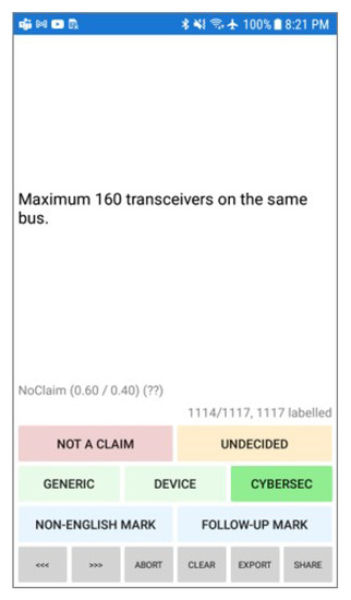 We manually labeled sequences extracted from a sample of ICS device documents. Claim sequences were initially categorized into three types, including generic claims, device claims, and cybersecurity claims. Having these individual claim types will help future investigation regarding claim type detection. For the purpose of this study, we grouped all these types of claims as claim labels and also removed the sequences with the “Not Sure” label from the classification dataset.