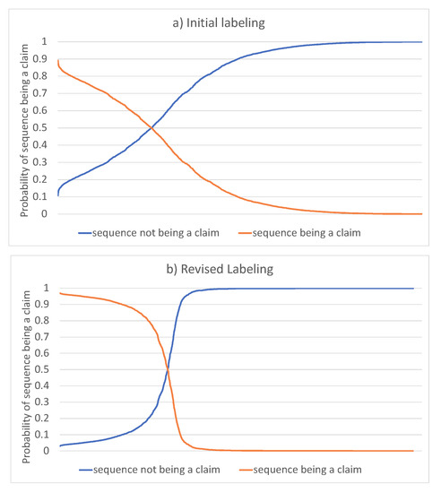 After this label review process, we repeated the fine-tuning process to obtain new model parameter values. A comparison of the obtained results pre- and post-label review demonstrate the improvement to CyBERT from this iterative refinement process. The obtained probabilities were sorted and plotted in the