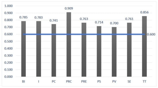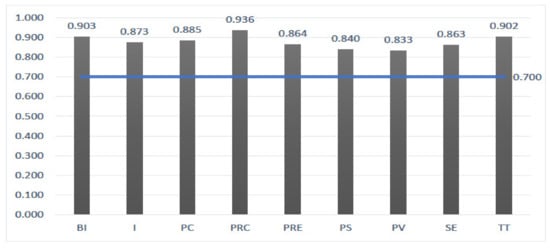Thus, we examined internal consistency via composite reliability (CR) in Figure 2, the average variance (AVE) in Figure 3, and Cronbach’s alpha in Figure 4. Values were all above the threshold of 0.60 (ranged from 0.700 to 0.909). The AVE values vary within the limits of 0.625 to 0.822, CR values ranged from 0.833 to 0.936, everything well above the minimum recommended of 0.50 and 0.70, respectively. Table 1 shows the factor loadings for each construct (27 in total), which all exceed the recommended value of 0.70.
