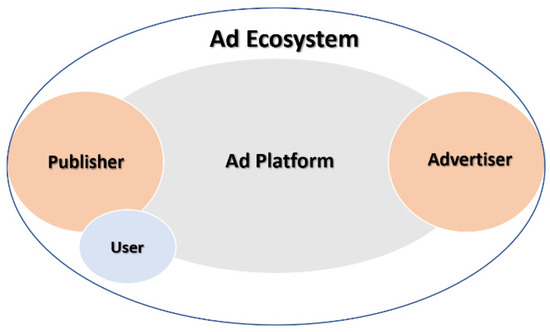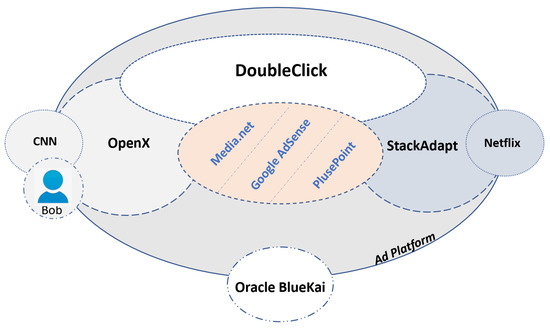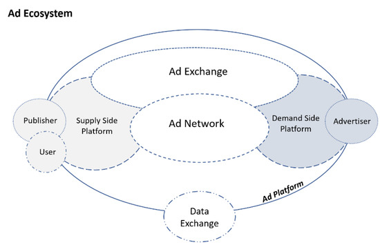 Ad Platform is a framework that connects advertisers to publishers. Alternatively, it is a group of entities that facilitate matching the demand and the supply end of the ad ecosystem [6]. On one side, ad platforms assist publishers in finding the best match between their audiences and the advertisements they are supposed to showcase; on the other side, they help advertisers reach the most appropriate potential audience and customize the advertising material to them. The modern ad platforms are made up of a number of distinctive intermediate entities, including Ad network, Ad Exchange (AX), Supply Side Platforms (SSPs), Demand Side Platforms (DSPs), and Data Exchange. Each of these entities has unique responsibilities and mechanisms of operation; and, when all the entities work synergistically, they make the ad platform processes more effective, flexible, and transparent. The role of different entities comprising the Ad Platform is illustrated in Figure 2 and described below.