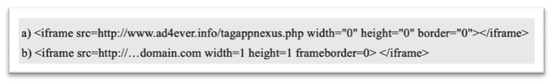 Figure 4. Examples of stuffing ads. (a) Creation of an entirely invisible inline frame loading an Ad4ever page [49]. (b) Stuffing ads in a small iframe, e.g., 1 × 1 pixel [1]. - Fake Sites: Placement of ads on fake websites is another strategy commonly deployed by online fraudsters. Fake websites used for the purposes of ad fraud typically have one or more of the following features: