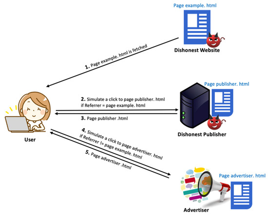 - Malvertising: Malvertising is a form of placement fraud that is carried out by utilizing advertising malware that gets injected into a publisher’s website, and that ends up displaying unwanted ads or pop-ups on the computers of users visiting this site. Sood et al. [48] have pointed out that the common defects in the design of some website widgets pose a high risk of malvertising. Moreover, they have shown that Content Delivery Networks (CDNs)—as third-party ad servers which provide content to different domains on the Internet—are the primary means of spreading malvertising malware. By exploiting the servers of a particular CDN, attackers can inject malicious code in the form of malvertisement and achieve a broad distribution.