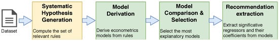 Our methodology is summarized in Figure 1. First, association rule mining is employed to generate the set of relevant rules (1). For our purpose, we treat each mined rule as a candidate hypothesis for bias. In step (2), we generate regression models by considering the variables included in each selected rule and regress over them to generate the model estimates of the considered outcome variable. In step (3), a model comparison is performed to eliminate ‘redundant’ models that do not add relatively more information to the prediction than a simpler model does. This leaves us with only ‘winning’ models that, among all evaluated candidates, provide the more convincing evidence for some effect, if any. Finally, in step (4), we extract the coefficients of these selected models to identify (sub)populations of interest for which there is statistical evidence of bias in the decision making. Then, we provide a detailed breakdown of each step of the methodology.