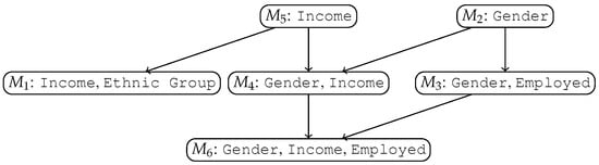 The three models in Example 2 along with other hypothetical regression models can be represented in a hierarchy, as shown Figure 2. The hierarchy has two root nodes, i.e., and , each with two children ( and for , and for ) among which one is in common (i.e., ). is further extended by , which is also a child of .