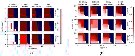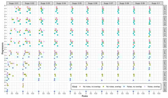 In total, we generated 12 datasets by varying the number of discriminated groups (i.e., 1, 2 and 3) and the complexity of the dataset to test our methodology in different situations. The complexity of a dataset is defined over two dimensions: (1) presence/absence of noise, intended as subjects that do not belong to any of the generated context groups but in which one or more context variables assume a value used in one of the discriminated groups; and (2) the presence/absence of overlapping, meaning that subjects in two or more discriminated groups share at least a context variable and its value. Combining these two dimensions, we obtain four types of datasets: (i) without noise and overlapping, which represents the simplest situation; (ii) without noise but with overlapping; (iii) with noise but without overlapping; (iv) with noise and overlapping, which represents the most difficult situation to deal with, since spurious correlations can easily arise (note that the presence of overlapping only has an impact when more than one discriminated group exists). For every dataset, we generated a total of 10,000 subjects; among them, every discriminated group covered 25% of the dataset. We chose 25% to strike a balance between absolute minority (<50%) and small groups. For every dataset, we tested several configurations of support, which varied between 1% and 10% with a step of 1%, and confidence, which varied between 50% and 95% with a step of 5%. Note that when generating the regression models, we did not consider potential interactions among the variables in the experiments; namely, we used only factors of the first order when computing the regression models. While this choice can lead to lose some interesting correlation, it provides us with a good approximation of the relations characterizing the decisional process, and prevents the generation of noisy recommendations. Directionality is given by the sign of the corresponding coefficients.