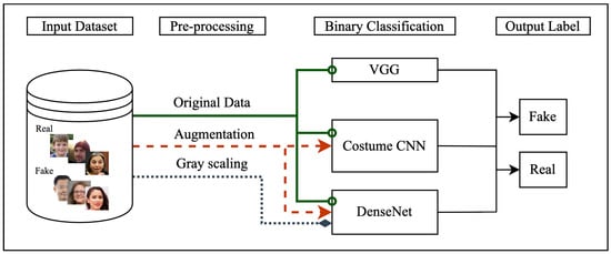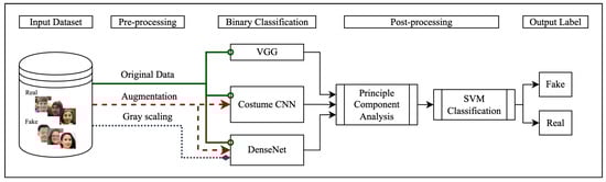 Our proposed method for deepfake detection on images is shown in Figure 1. We have taken two different classification procedures in this work. As shown in both Figure 1 and Figure 3, input data goes through the same procedure with the same architecture; however, Figure 3 demonstrates a second round of analysis with an additional post-processing classification step that has been added to the last output layer of the analyzed models. The second round of analysis with additional post-processing was performed to analyze the effects of principal component analysis on the task of deepfake classification. Further details about the post-processing step are described in the final paragraphs of the evaluation subsection of this section.