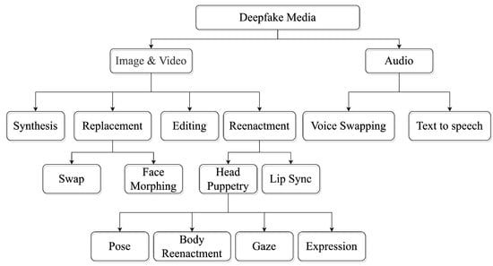 Anti-deepfake technology can be divided into three categories: (1) detection of the deepfake; (2) authentication of the published content; and (3) prevention of the spread of contents that can be used for deepfake production. Technology towards detection and authentication of deepfakery is growing fast; however, the capacity to generate deepfakes is proceeding much faster than the ability to detect them. Twitter has reported attempts to publish misinformation and fake media by 8 million accounts per week []. There has been a wide variety of deepfake media, and the detection techniques that have been used to identify them is shown in Figure 2. This has created a massive challenge for researchers to provide a solution that can promptly analyze all the posted material on the Internet and social media platforms to identify deepfakes. Previous research has mostly aimed at improving previously developed technologies to train a new detection system.