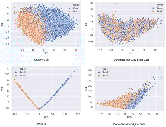 The results of this study demonstrate that VGG-19 can be a suitable choice not only for partial face images, but also for full-face images confirming the findings of []. The better performance of VGG-19 is because it is pretrained on a wide variety of objects. AP was used as an aggregation function to summarize the precision–recall curve into a single value that represents the average of all precisions. VGG-19, even though it had the highest accuracy, had the lowest AP of 95% in comparison to all other analyzed models. The DenseNet architecture on the original dataset and grayscale dataset had a closer performance to VGG-19, with 94% accuracy. Results from DenseNET architecture demonstrates that gray channel-based analysis does not have a huge impact on model accuracy level in classifying images into the two categories of real and fake. The DenseNet architecture, even though was second best in terms of performance, achieved an AP of 99% on both augmented and grayscale datasets, which is slightly in contrast to the results found in [] in terms of precision rate; however, it aligns with claims regarding detection time. Custom CNN architecture had the lowest accuracy level (89%). The second-highest AP score after DenseNet was the Custom CNN model. Augmented input reduced model performance and accuracy level on both DenseNET and Custom CNN by 5–22%. However, the Custom CNN had a better performance on augmented data in comparison to the DenseNet architecture. Precision and recall rates from DenseNet architecture trained on augmented data suggest that the final dense block that we have coupled with the DenseNet classification layer did not have a positive impact on model behavior. The issue with reduced performance on augmented data might be resolved by training the model for a larger number of epochs, since augmentation results in harder training samples. VGG-19, even though it was great in terms of performance, aligns with results from []; it was computationally very expensive, especially if fed with augmented data. DenseNET was computationally more efficient in comparison to VGG-19 and Custom CNN, which aligns with the results from []. The F1-score of the DenseNet architecture on grayscale was the highest, reaching 97% suggesting it could be a suitable backbone when dealing with unbalanced class distribution in their dataset. The second-highest F1-score was achieved by VGG-19, as it achieved a 95% F1-score. The lowest F1-score was achieved by the Custom CNN on augmented data, as the F1-score was only 85%. Taking F1-score as a measurement to balance precision and recall, DenseNet on grayscale data might seem to be a better solution, however, since the dataset used for training in this analysis had a balanced class distribution accuracy level and is a better judge in this analysis. The results from the PCA-SVM classification demonstrated that VGG-19 was able to form a distinctive cluster of fake and real images using the PCA vectors as a representation of the image (demonstrated in Figure 5). Custom CNN architectures and DenseNet trained on the original and augmented datasets showed decent classification. However, DenseNet trained on grayscale images presented very poor performance (Table 5).