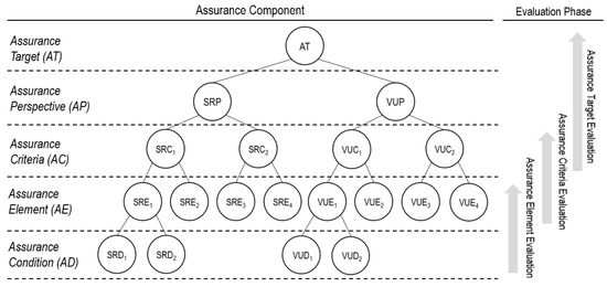 SA evaluation is a systematic process of assigning meaningful scores to the assurance target that indicate its security posture [27]. The higher the value, the better the trustworthiness of the system product against its security mechanisms. For deriving the final score, in our approach, metrics of assurance components are computed using a bottom-up approach, which involves the estimation of at the lowest possible level of detail. It is essential to be able to define what is meant and how to measure it when SA is evaluated. We suggest an aggregation method for doing so by using the model as the structure for estimating values related to SA into a single measure. Figure 2 depicts the hierarchical structure of the SA evaluation based on the proposed SA evaluation model, while Table 4 describes each notion. Our quantitative approach divides the SA evaluation into three sequential phases: the first phase of evaluation is responsible for the assessment of the assurance elements; the second phase for the evaluation of the assurance criteria; and the third for the assurance perspectives, in turn, of the overall assurance level of the assurance target. With the term “evaluation”, we refer to the assignment of a metric to each component in the model. Metrics represent measurement or evaluation indexes that are given attributes to satisfy the security assurance evaluation. The three-phase quantitative process is discussed in the following subsections.