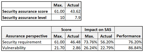 In Figure 3, the “top-level” scoreboard structure is presented, which comprises assurance metrics showing the summarized SA evaluation result of the assurance target, including the overall assurance score, the assurance level, and the assurance metrics in the perspective of the security requirement and the vulnerability. These data provide a “panoptic view” by aggregating the metrics from both sets of assurance perspectives (security requirements and vulnerabilities). For a better comparison of metrics, the corresponding maximum and actual values are listed side-by-side. From Figure 3, we can see that the security requirement perspective has a major role in the overall SA evaluation since it achieves up to 73.76% of the assurance score, while the vulnerability perspective, on the other hand, contributes only 26.24%. Furthermore, in terms of performance, the security requirements generally gain a worse score than vulnerabilities (76.20% vs. 86.84%). Thus, it is suggested that security requirements should be treated as higher priorities while taking improvement actions.
