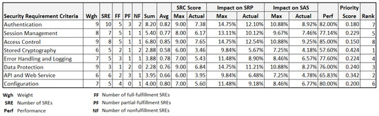 Except for the metrics introduced in the previous sections, several new ones are added to the scorecard to enhance the analysis capabilities, including the security requirement fulfillment metrics (divided into full, partial, and weak fulfillment), vulnerability existence metrics (divided into existence and non-existence), and the ranking numbers. The ranking numbers are generated following the ascending order of the criteria. As we can see in the rank, the security requirement “Stored Cryptography” has the highest priority, meaning it does not perform very well and is currently the most crucial in security assurance evaluation, concluded in line with our previous analysis. Therefore, the stakeholders should emphasize more on this criterion to improve the security level of the assurance target.