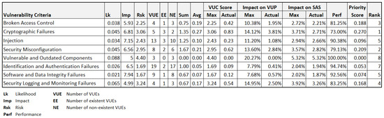 According to the vulnerability metrics shown in Figure 5, the criterion “Vulnerable and Outdated Components” has a maximum impact on security assurance score, meanwhile, it reaches an outstanding performance (100%). As the poor performance of “Cryptography” is identified in the security requirement perspective, the corresponding weakness in terms of the “Cryptographic Failures” is also disclosed in the vulnerability perspective (performance: 73%).