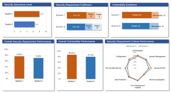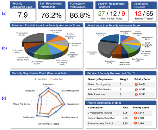 The lower row (Figure 6c) is divided into two separated panels. The left panel provides a comparative analysis of security requirement criteria. The use of a radar chart is useful for seeing which criteria are scoring high or low, and the variation between the maximum and actual value. The right-side panels identify the top three critical security requirements and vulnerabilities that the security stakeholders should assign high priorities to improve the security assurance score.