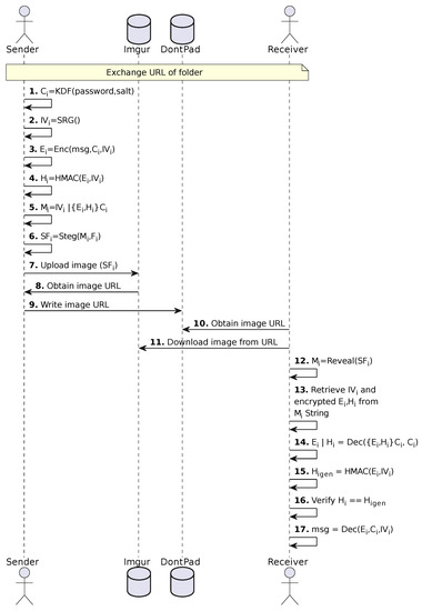 Afterwards, users can exchange messages. A sequence diagram is depicted in Figure 3. The sender starts by securely deriving a channel key () from the password and the salt (Step 1). In Step 2, an initialization vector is generated with a secure random generator. Afterwards, in Step 3, the key and the are used to encrypt the plaintext message using symmetric encryption (e.g., AES), generating the ciphertext . In Step 4, the sender generates a Hash-Based Message Authentication Code (HMAC) [38,39,40,41] from the ciphertext and . The ciphertext , HMAC , and a nonce are encrypted with the key and then concatenated with in Step 5—these data shall be referred to as . In Step 6, the secret data is hidden through steganography, being embedded into an image file , which has had its EXIF data scrubbed clean, resulting in the stego-image . The sender then, anonymously, uploads to the image-hosting service (Step 7), obtains its URL (Step 8), and writes the URL to a folder on the text-hosting service (step 9). Next, the receiver can read the shared folder on the text-hosting service, obtain the new URL (Step 10), and proceed to download (Step 11). Then, he/she extracts the embedded data (Step 12) to retrieve and the encrypted and (Step 13). In Step 14, and are retrieved after decryption, and afterwards, a new HMAC is generated from the retrieved and (Step 15). and are compared to ensure the integrity of the message (Step 16). Finally, in Step 17, the plaintext message is retrieved by decrypting with the key and the initialization vector .