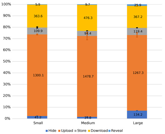 Figure 4 presents the PoC runtimes with standard deviations (in milliseconds) of each step per image size normalized to 100%. For all image sizes, upload takes the most time (between 60% and 70% of the total time elapsed), followed by download (around 20% of the total time elapsed). Shorter durations were obtained for small images.