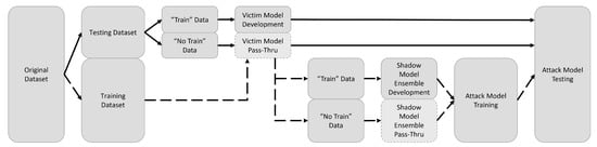 Diagram illustrating the flow of data through the attack process. The original dataset is divided into a training (60–) and testing dataset (20–). One half of the training data is used to develop the shadow model ensemble and is labeled as Trained data given that it is used to train the ensemble. The other half of the training data is labeled as Not-Trained data since it is not used to develop the ensemble but is instead simply passed through the ensemble for the retrieval of output vectors. These two halves are then recombined as a labeled Trained/Not-Trained dataset that is used to train the attack model, which can classify if an observation was used to train the ensemble or not. Finally, this attack model was tested on the victim model with the previous testing dataset—half of which was used to train the victim model and labeled Trained data, and the other half of which was simply passed through the victim model to obtain the output vectors.