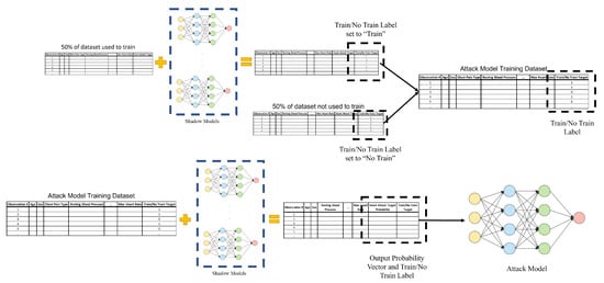 Once the shadow models were developed, the one-half of the training dataset that was utilized to train the shadow models, was labeled as Trained, and the half that was not used was labeled as Not-Trained. The entire shadow model training dataset was then passed through the shadow model ensemble in order to obtain an output probability vector. This vector along with the label of Trained/Not-Trained and the original set of dataset features were utilized as an attack model dataset in order to create a binary classification model that can determine whether an observation was utilized in training of the victim model as shown in Figure 2.