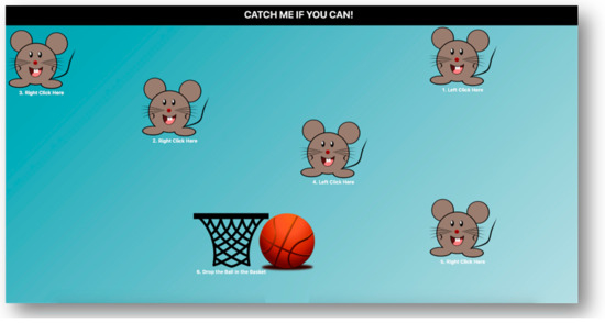Our interactive web platform, which was developed for the purpose of mouse dynamics data collection, is hosted on AWS (Windows Server IIS) and is accessible through the following URL: http://human-likebots.com (accessed on 25 February 2023). On the front/user-facing end, the platform simulates a simple ‘Catch Me If You Can!’ online game (refer to Figure 1). The game web-page contains a JavaScript code which captures the actual mouse dynamics data (i.e., mouse move, load, click, scroll, … events) as well as the associated metadata. Specifically, in the time interval during which the user stays on the web-site and plays the ‘Catch Me If You Can!’ game, the script preforms a discrete ‘event polling’ of various event listeners every 30 ms. In addition to recording the mouse-dynamics-related events, the script also captures the timestamps and x–y coordinates of the recorded events, mouse speed, session ID and screen size. The data collected by the script are first buffered and then sent to the back-end server every few seconds (we decided against shorter sampling and transmission intervals to avoid unnecessary data overhead). Using the Django Rest Framework [34], the server-side web application is able to receive and store the recorded event data in a log file (CSV format). The client- and server-side applications do not record any personal information about the users interacting with the human-likebots.com site.