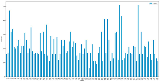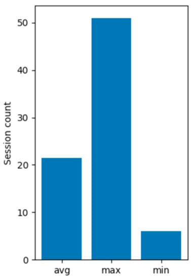 In order to collect real human-user data, our interactive human-likebots.com page was deployed on the Amazon MTurk platform (MTurk is a crowdsourcing marketplace that allows researchers to hire anonymous virtual workers to complete human intelligence tasks for pay. Currently, MTurk offers access to over 500,000 virtual workers from 190 countries). We specifically requested 100 MTurk users to visit and interact with our ‘Catch Me If You Can!’ site by playing multiple rounds of the game—for a total duration of 5 min. In each round of the game, the users were asked to follow six steps and perform three different actions, including left-click, right-click and drag-and-drop actions. We considered each round played by a particular user as a separate mouse movement session. Figure 2 shows the total number of sessions generated by each participating user, while Figure 3 shows the minimum, maximum and average session counts over all 100 users.