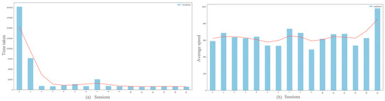 (a) Time taken to complete each of 16 conducted sessions for user number 82; (b) Average mouse movement speed for each of 16 conducted sessions.