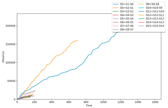 Note that we opted for the use of the DTW distance metric in our analysis as it has allowed us to measure the distance between two sessions (two time series) of different lengths and different time-wise alignments (DTW re-aligns two feature vector sequences by warping the time axis iteratively until an optimal match between the two sequences is found [35]). Figure 7 provides a closer look into the trajectories of two particular sessions (number 13 and 14) of user 82 and their respective DTW cumulative distance.