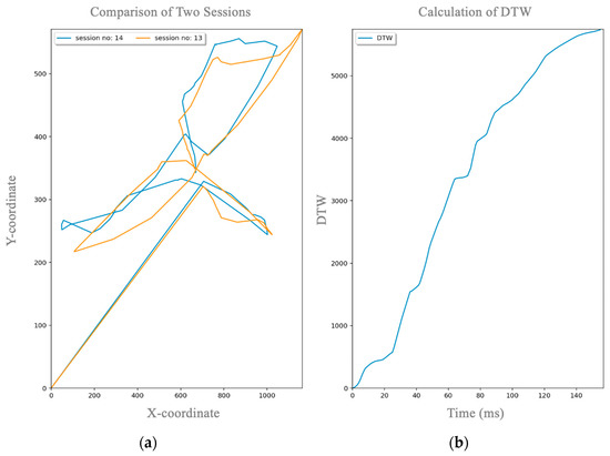(a) Trajectories of sessions 13 and 14 of user 82; (b) Cumulative DTW distance between two sessions.