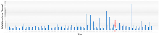 Minimum DTW normalized cumulative distances across sessions of each individual user.