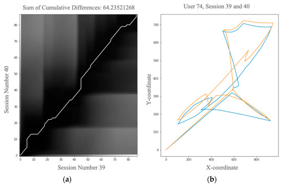(a) Sum of cumulative DTW distance value in sessions generated by the same user, user 74; (b) Sessions 39 (blue) and 40 (orange) of user 74.