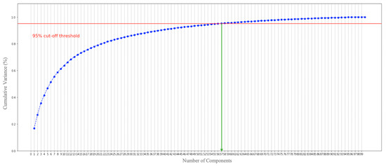 Using VGG16, we ended up with each image (i.e., user session) being represented as a vector with 1000 features [43]. To further reduce the number of features identified with VGG16, next, we used principal component analysis (PCA) [44]. PCA produced 100 eigenvectors over the VGG16 feature space. Nevertheless, as shown in Figure 10, not all of the 100 identified PCA eigenvectors are of the same significance, as 95% of data variance occurs over the first 57 eigenvectors. Thus, for the purpose of our ML-based analysis (as discussed in the next section) we opted to map our original ReMouse dataset into a set of feature vectors over the first 57 most significant PCA eigenvectors.