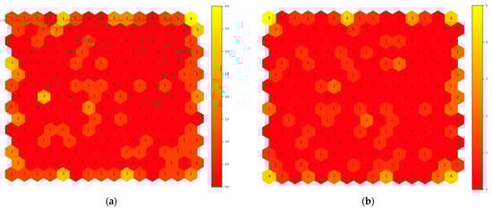The heatmaps generated on each of the two trained SOM maps are shown in Figure 11a and Figure 11b, respectively. An SOM heatmap is produced by displaying how many of the training inputs are associated with each node in the trained SOM map [48]. It is very evident from the two heatmaps that there are no actual (i.e., distinguishable) clusters in either ReMouse Subset-3 or ReMouse Subset-5—as most neurons are ‘fired’ by no/one single-input point, and only a handful of neurons are fired by two or more (distinct) input points. It should also be noted that the neurons with an input-data membership of two or more are largely distributed at the edges of the respective SOM maps, which suggests that the actual ‘closeness’ of the input points that fire these neurons may not be significant. Border neurons in an SOM map do not ‘stretch out’ during the training process as much as they should, and as a result they tend to ‘attract’ many potentially very different/distant points located on the ‘outside’ of the SOM border. This phenomenon in known in the literature as the ‘SOM border effect’ [49].