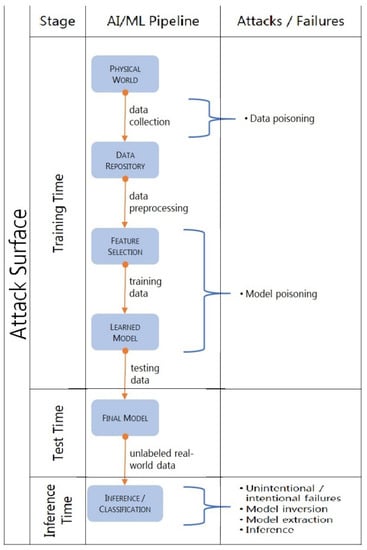During the learning or training stage, an AI system needs data for training a machine learning model. The training data are subject to manipulation attacks, requiring that their integrity be verified. Ma et al. [] used a visual analytics framework for explaining and exploring ML model vulnerabilities to data poisoning attacks. Kim and Park [] proposed a blockchain-based environment that collects and stores learning data whose confidentiality and integrity can be guaranteed. Mozaffari-Kermani et al. [] focused on data poisoning attacks on, and the defenses for, machine learning algorithms in healthcare.