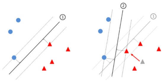Figure 2 explains the poison attack on the SVM classifier. The left sub-figure indicates the decision boundary of the linear SVM classifier, with support vectors and classifier margin. The right sub-figure shows how the decision boundary is drastically changed by tampering with one training data instance without changing the label of the instance. It was observed that the classification accuracy would be reduced by 11% by a mere 3% manipulation of the training set []. Nelson et al. [] showed that an attacker can breach the functionality on the spam filter by poisoning the Bayesian classification model. The filter becomes inoperable under the proposed Usenet dictionary attack, wherein 36% of the messages are misclassified with 1% knowledge regarding the messages in the training set.