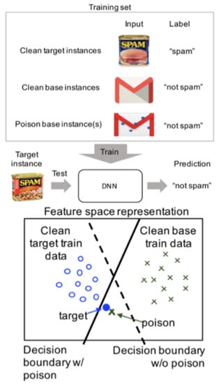 Poisoning attack occurs when the adversary contaminates the training data. Often ML algorithms, such as intrusion detection systems, are retrained on the training dataset. In this type of attack, the adversary cannot access the training dataset, but poisons the data by injecting new data instances [,,] during the model training time. In general, the objective of the adversary is to compromise the AI system to result in the misclassification of objects.